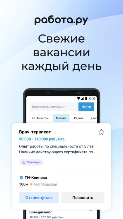 Работа.ру — это ваш надёжный партнёр в поиске работы. Скачайте приложение бесплатно и откройте для себя тысячи возможностей для профессионального роста. Находите подходящие вакансии, связывайтесь с работодателями напрямую и делайте уверенные шаги к карьере вашей мечты!